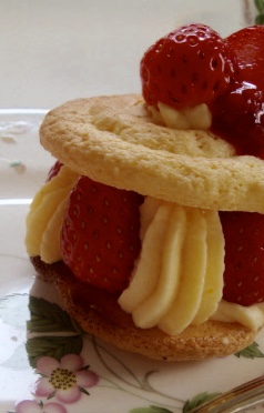 フランスのいちごのショートケーキで、アーモンド入りビスキュイの間に、いちごとクリームが詰まった、人気のケーキです。